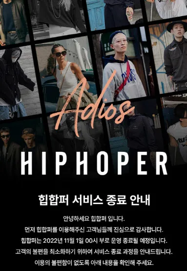 올해 11월 1일 패션 플랫폼인 힙합퍼가 서비스를 종료했다고 해요. 국내 스트리트 패션을 이끈 1세대 쇼핑몰이자 한 때는 무신사와 선두 경쟁을 벌일 만큼 인기가 높았어요. 중견 여성 패션업체인 바바패션에서 2018년에 힙합퍼를 인수했지만 수익성 악화로 올해 8월에 매각에 실패하면서 서비스를 접게 되었어요.