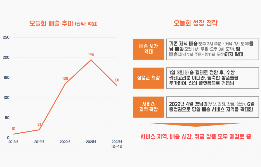 하지만, 2021년이 되며 성장이 둔화되기 시작했는데요. 내부적으로 위기감을 느낀 오늘회는 칼을 빼듭니다. 배송 시간을 일 1회에서 3회까지 확대, 상품군도 농축산 전체로 확장했어요. 서비스 지역도 경남권, 충청권 등으로 연이어 확장하며 4개월 만에 131억 원의 매출을 달성했습니다.