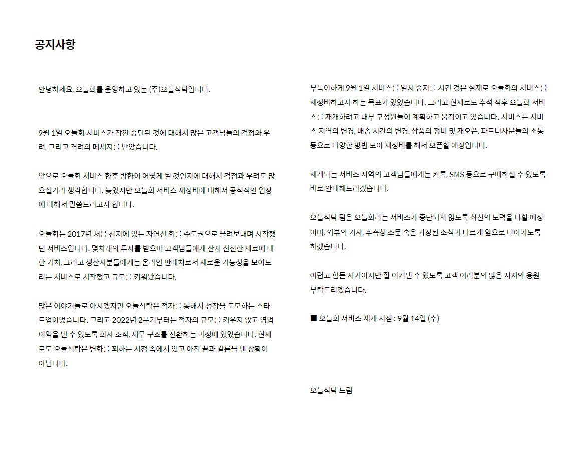 오늘식탁은 9월 공지를 통해 서비스 중지 이유와 함께 재정비 목표를 밝혔었는데요. 성장을 위해 감행했던 3가지 확대 전략을 재정비하여 배송 지역과 배송 시간, 상품군을 축소할 것으로 보여요.