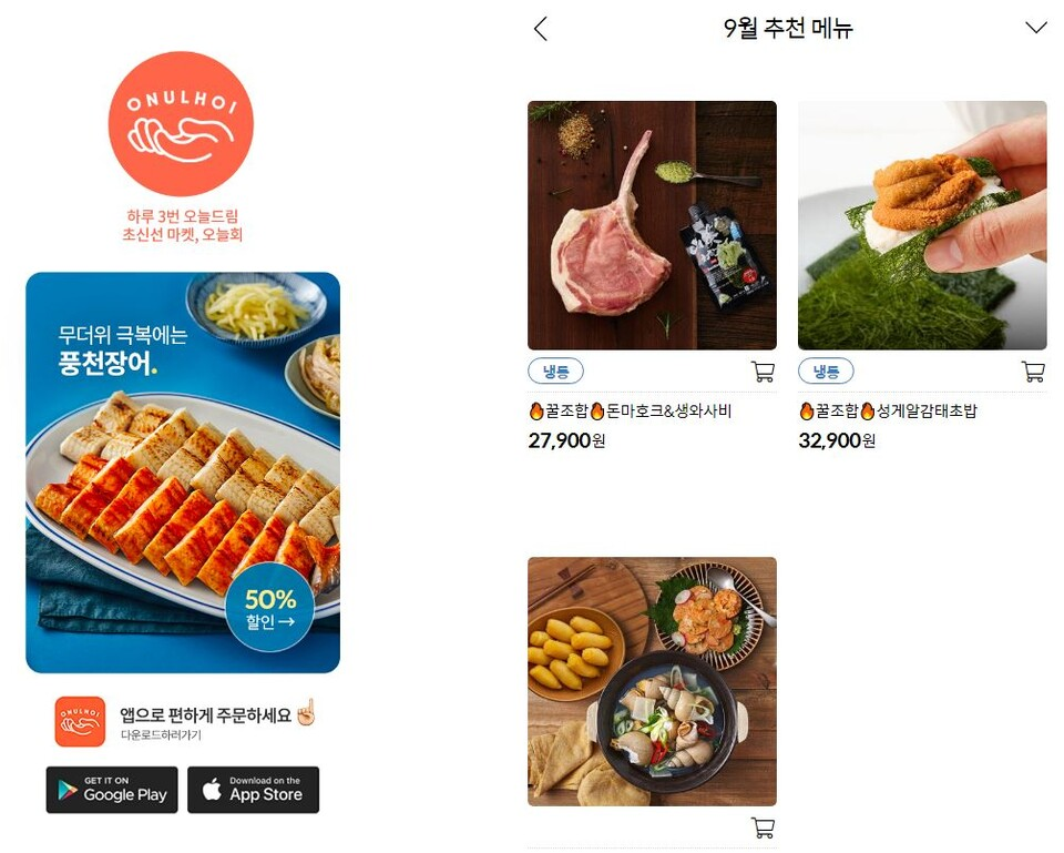 오늘회는 서비스 중단 2주 만인 14일에 판매를 재개했었는데요. 주문 가능 상품이 3개로 대폭 줄어들고, 당일배송 대신 이튿날 배송으로 대체되었습니다. 현재는 더 많은 상품이 당일배송으로 제공되고 있는데요. 여전히 많은 상품군을 들이지 못한 것으로 보아 어려움을 겪고 있는 것으로 보여요.