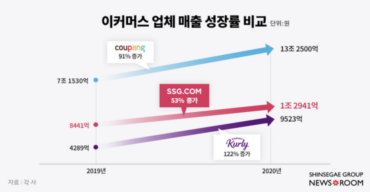 쿠팡이 뉴욕 증권거래소에 상장하며 100조 원에 가까운 기업가치를 인정받고, 흑자 전환에 성공했다는 소식에 이커머스 시장이 떠들썩했잖아요. 물론 신세계의 SSG닷컴도 나쁘지 않은 성장세를 보이긴 했어요. 하지만, 컬리와 같은 후발주자들이 역시 높은 성장률을 보이며 치고 올라옴에 신세계그룹은 위협을 느끼고, 새로운 돌파구를 찾아 나섰던 거예요. 그 돌파구가 바로 네이버와의 협업이고요. 둘의 지분 교환 내용을 살펴보자면요.