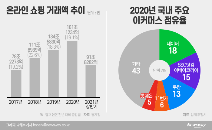 이번 쿠팡 흑자 전환 소식에 가장 먼저 주목받은 건 네이버였는데요. 이커머스 시장 점유율 1위 기업은 네이버거든요. 지난해 네이버는 17%, 쿠팡은 13%의 점유율을 기록하며 두 기업은 치열한 신경전을 벌이고 있어요.