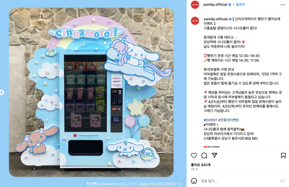 SPC삼립은 단순히 캐릭터빵을 출시한 것에 그치지 않고, 다양한 브랜드 캠페인을 전개하고 있습니다. 우선, 핫플레이스로 불리는 곳들에 빵 자판기를 오픈했어요. 성수에는 시티팝스타 콘셉트의 '쿠로미 자판기', 석촌호수에는 벚꽃 피크닉 콘셉트의 '마이멜로디 자판기', 강남에는 구름왕국 콘셉트의 '시나몬롤 자판기', 홍대입구에는 '헬로키티 자판기'가 있어요.