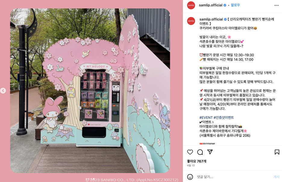 SPC삼립은 단순히 캐릭터빵을 출시한 것에 그치지 않고, 다양한 브랜드 캠페인을 전개하고 있습니다. 우선, 핫플레이스로 불리는 곳들에 빵 자판기를 오픈했어요. 성수에는 시티팝스타 콘셉트의 '쿠로미 자판기', 석촌호수에는 벚꽃 피크닉 콘셉트의 '마이멜로디 자판기', 강남에는 구름왕국 콘셉트의 '시나몬롤 자판기', 홍대입구에는 '헬로키티 자판기'가 있어요.