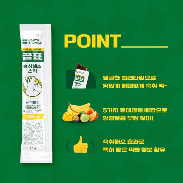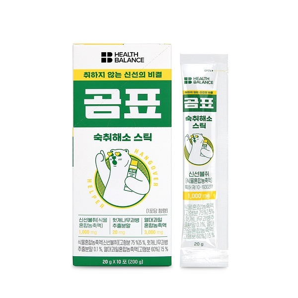 대한제분 '곰표'가 '헬스밸런스'와 콜라보해 열대 과일맛 젤리형 숙취 해소제를 런칭했어요. 젤리 형태라 먹기도 간편하고 무겁지 않다는 게 장점이에요. 곰표 숙취해소 스틱은 숙취 해소에 좋은 신선불취단 성분이 들어간 기능성 식품인데요. 귀여운 디자인과 숙취 해소 효능까지 확실히 갖추었어요. 눈길을 끄는 콜라보 디자인과 제품의 본질인 효능까지, 두 가지를 다 잡은 제품이네요.