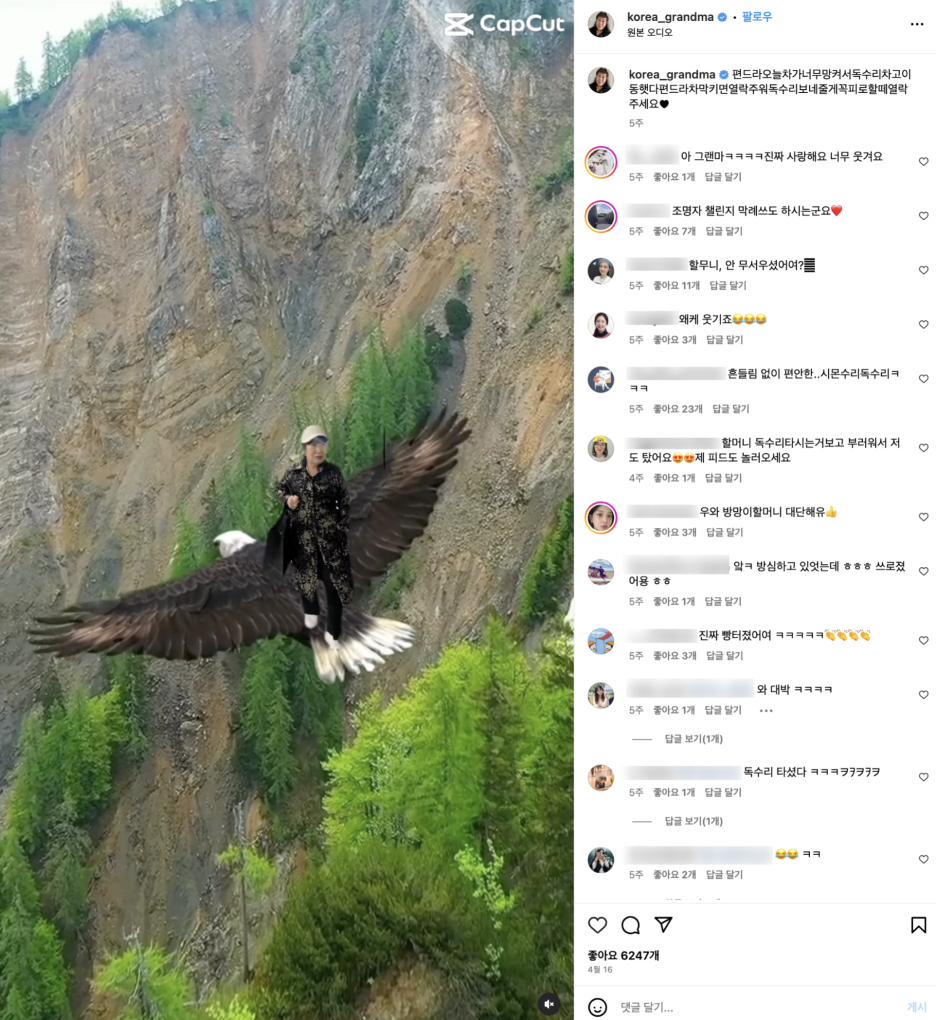 캡컷은 주로 10대들의 SNS로 여겨져 왔는데, 최근 다양한 연령층을 확보하게 된 계기가 있어요. '독수리 숏폼'을 보신 적이 있나요? #독수리타고날라봐요 라는 해시태그로 퍼진 이 밈은 날아가는 독수리 위에 사진이나 영상을 합성해서 마치 독수리를 타고 있는 것처럼 보이는 B급 감성의 밈이에요.