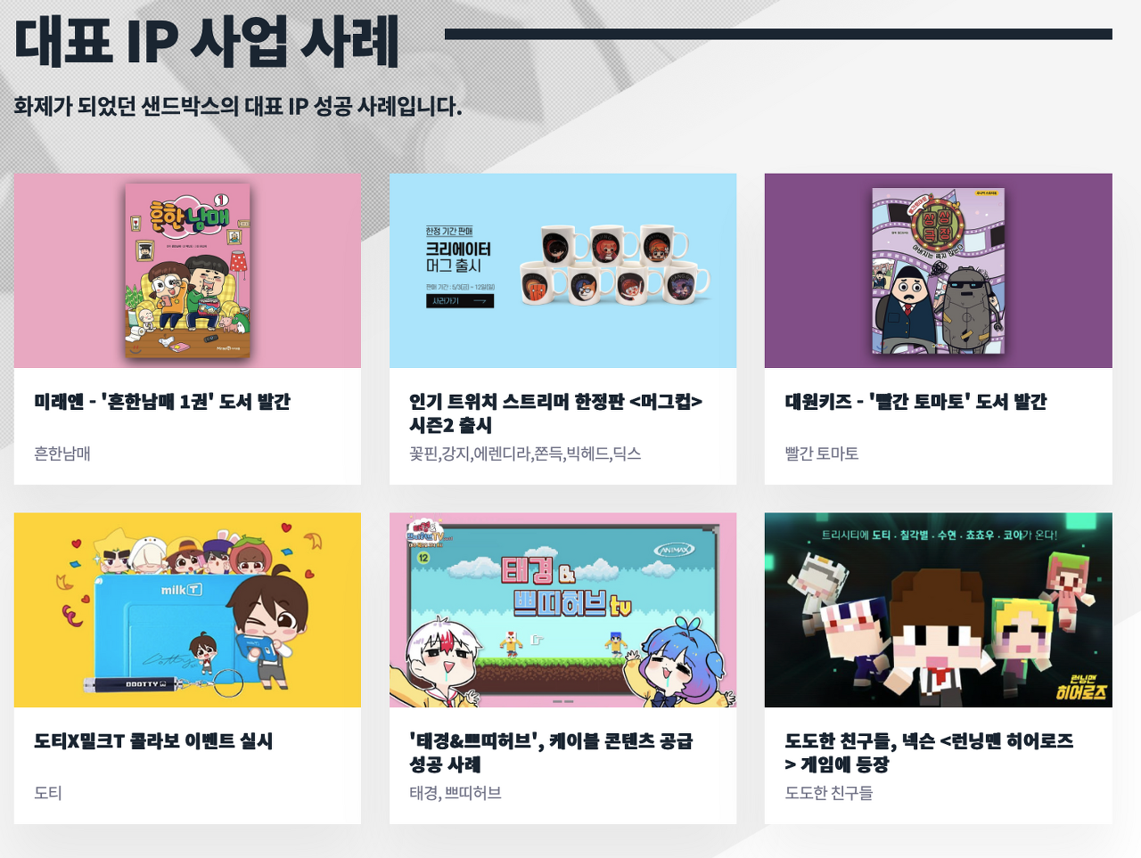 샌드박스는 콘텐츠 제작만으로는 수익을 올리기 어렵다는 사실을 알고, 창업 초기부터 고민하고 있었어요. 그래서 초기에는 유튜브 광고 수익, 크리에이터의 인지도를 활용한 협찬 광고를 받는 식의 수익모델을 가지고 있었지만, 이에 그치지 않고 크리에이터나 방송의 소재를 활용한 브랜디드 콘텐츠 제작, 크리에이터의 IP를 활용한 캐릭터 사업, 출판, 음반 제작 등의 비즈니스 모델 확대를 진행했어요.