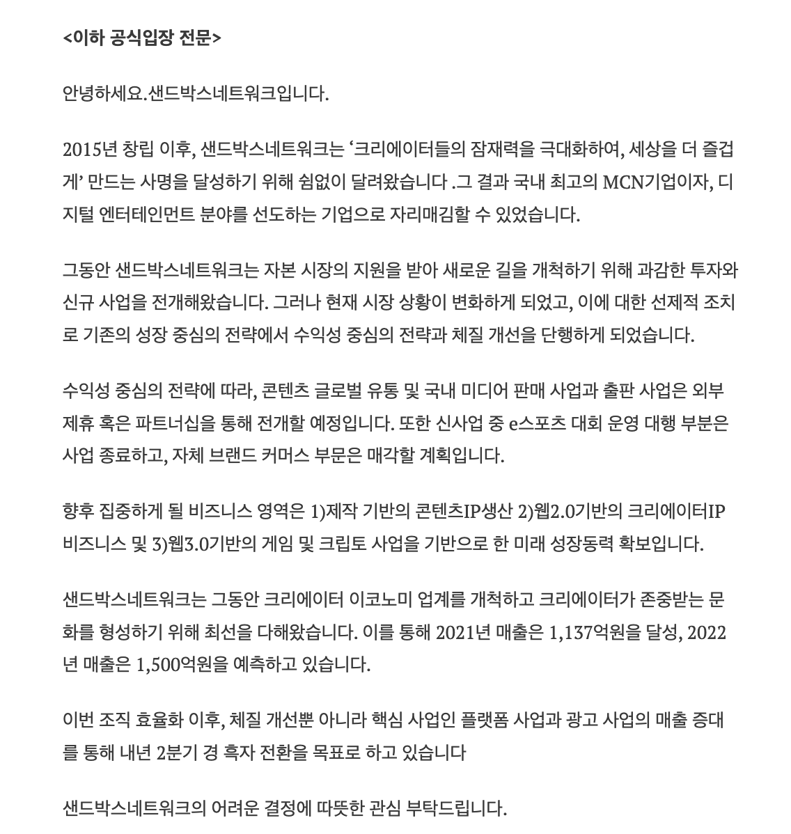 이번 게시글에서는 구조조정을 단행한 샌드박스네트워크에 대해 알아보았어요.