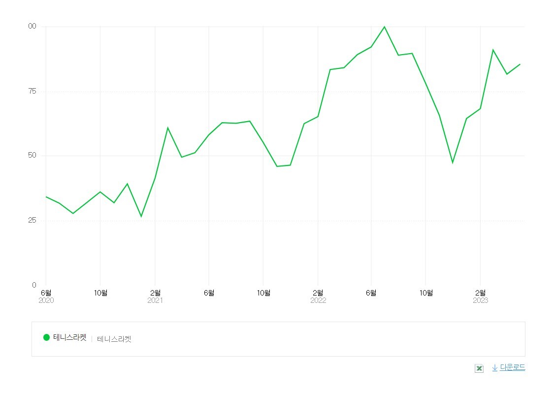 테니스를 시작한 다면 반드시 사야 하는 '테니스라켓'의 네이버 키워드 검색량을 살펴보니, 일단 정점은 지난 것 같아요.