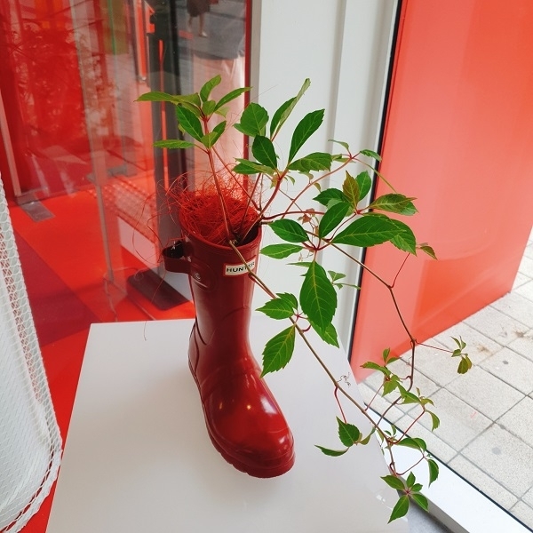 헌터의 대표 레인부츠 제품들을 식물들과 어우러진 공간으로 표현해 브랜드의 색깔을 표현하고 있어요.