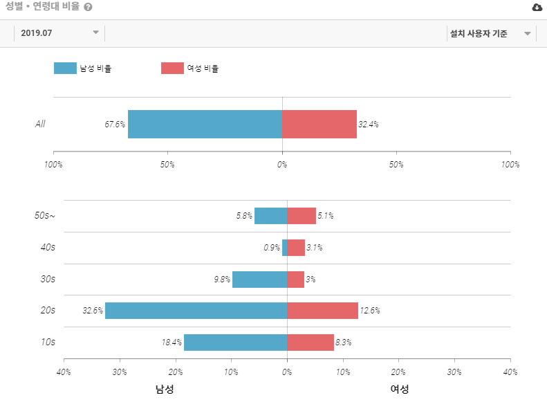 '무신사' 앱의 성별 비율은 전반적으로 남성이 더 높은 것으로 나타났습니다. 설치 사용자 기준으로 남성이 67.6%, 여성이 32.4%의 수치를 기록했습니다. 활성 사용자의 경우, 남성 69.8% 그리고 여성 30.2% 수치를 보였습니다.